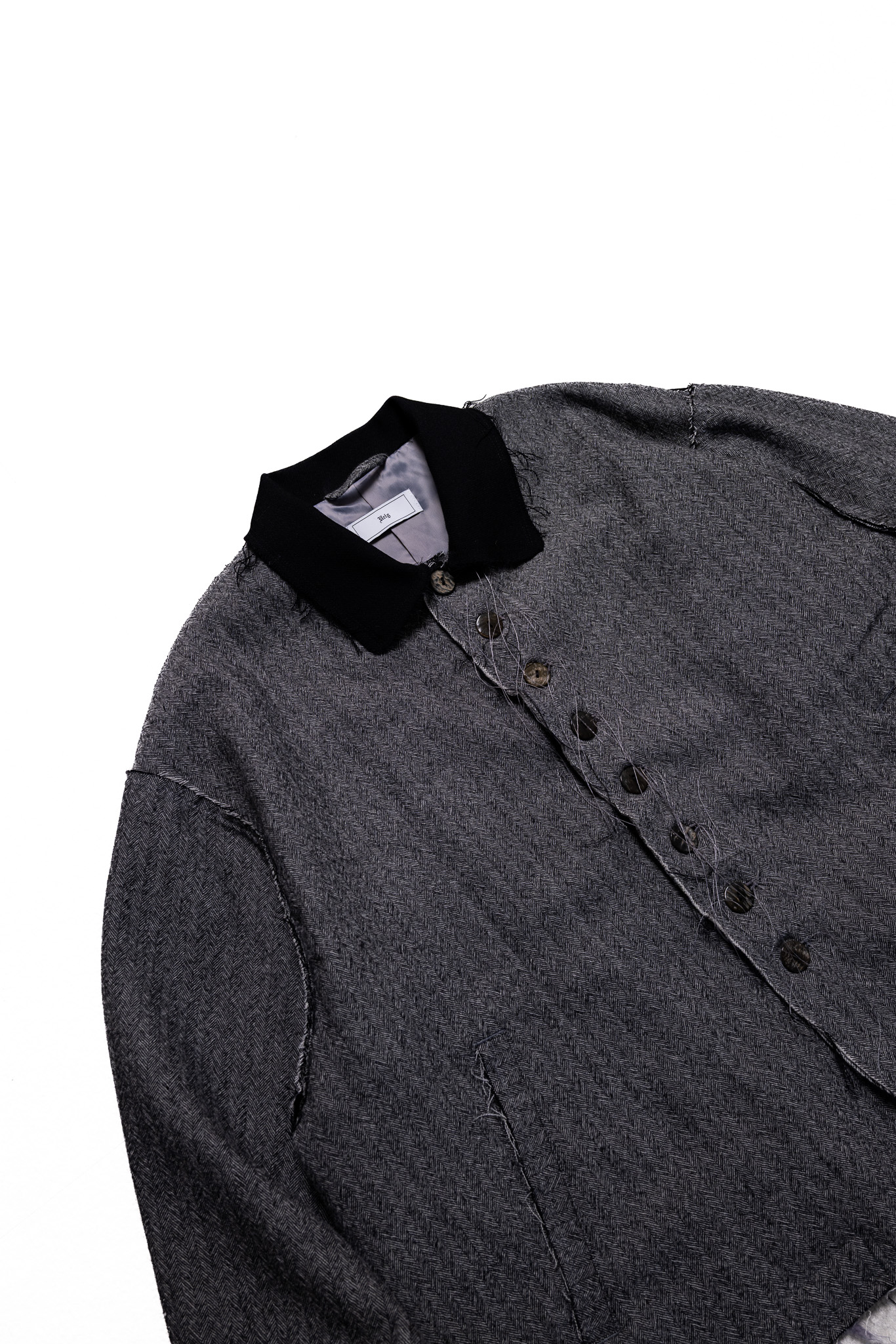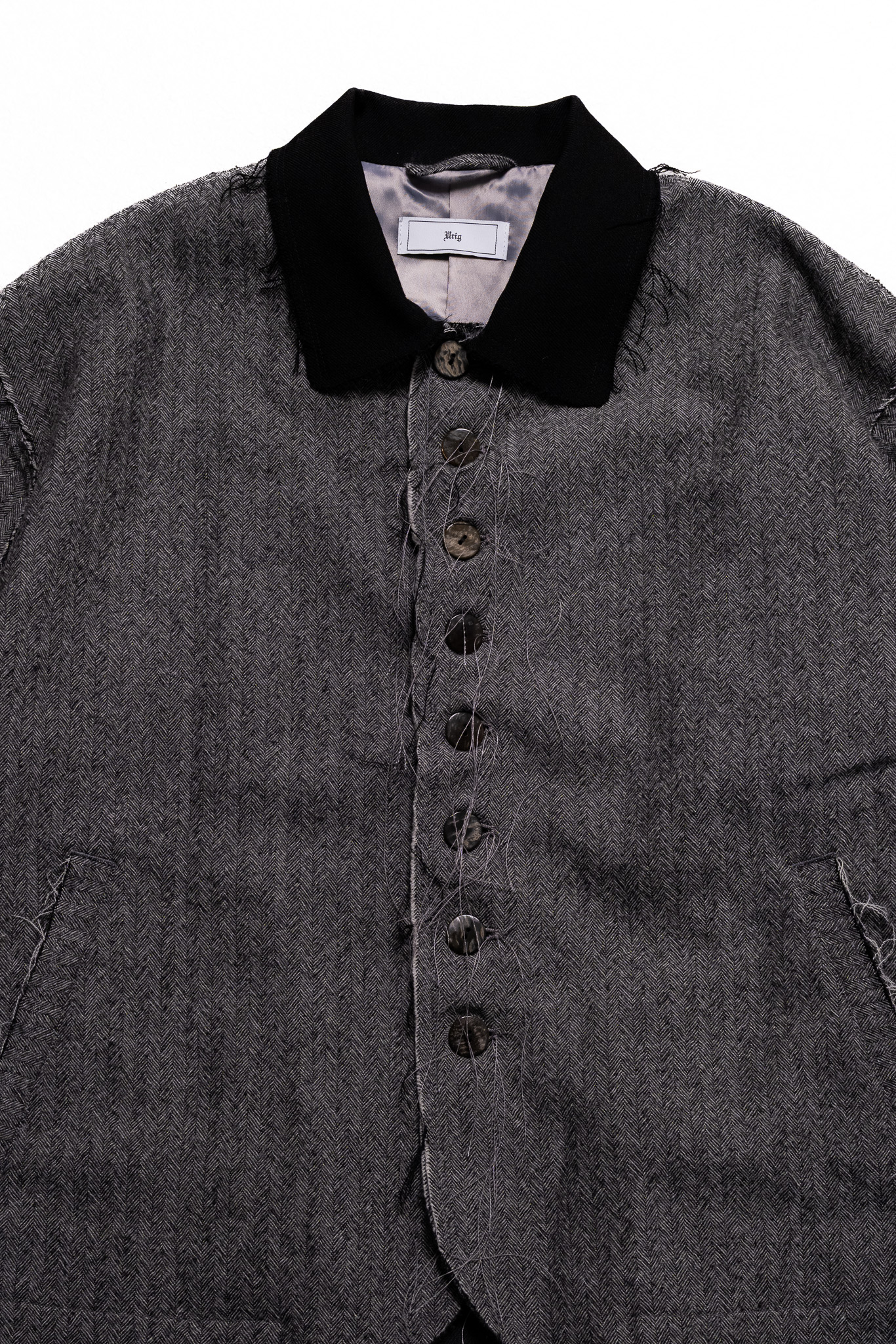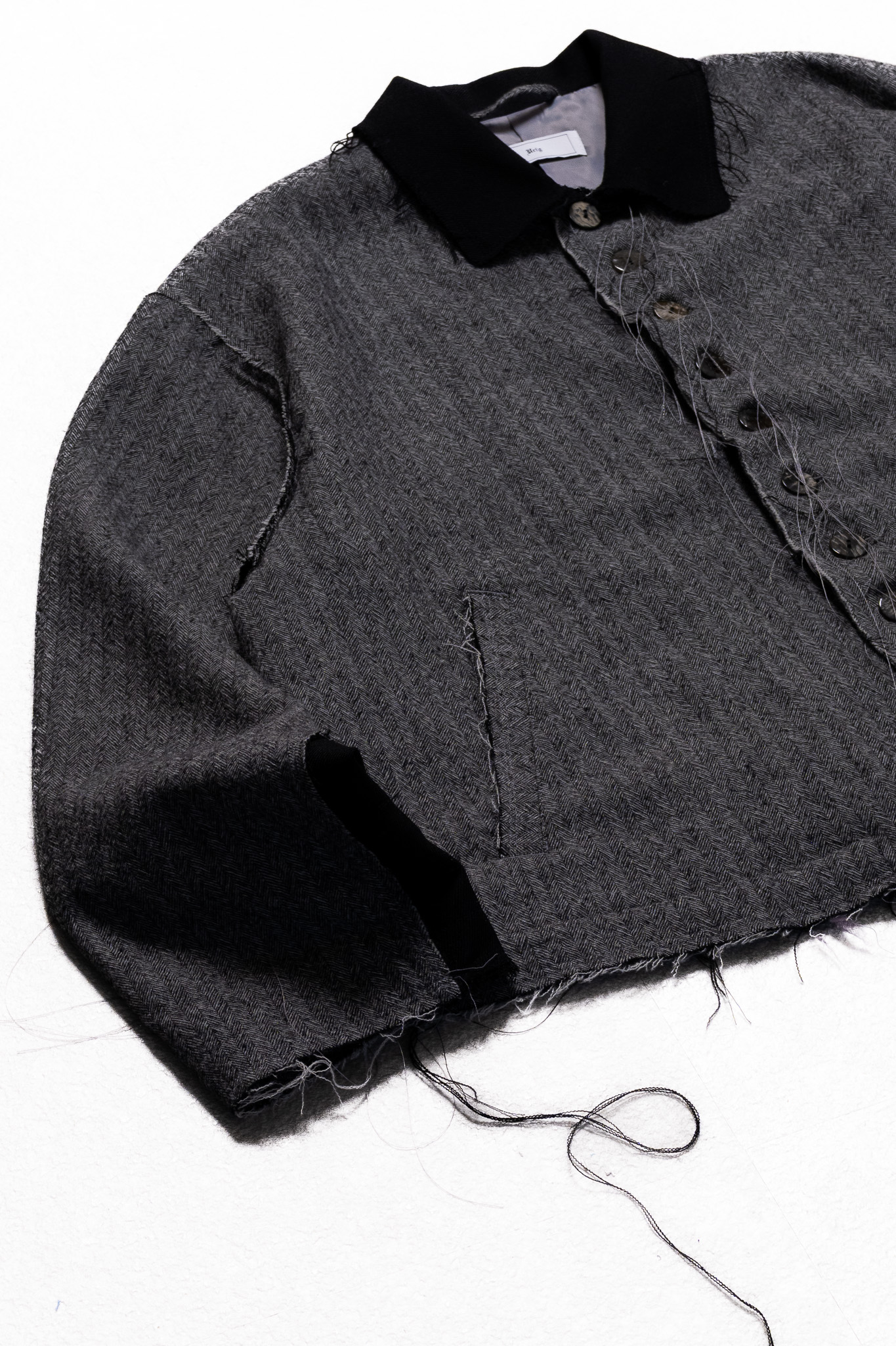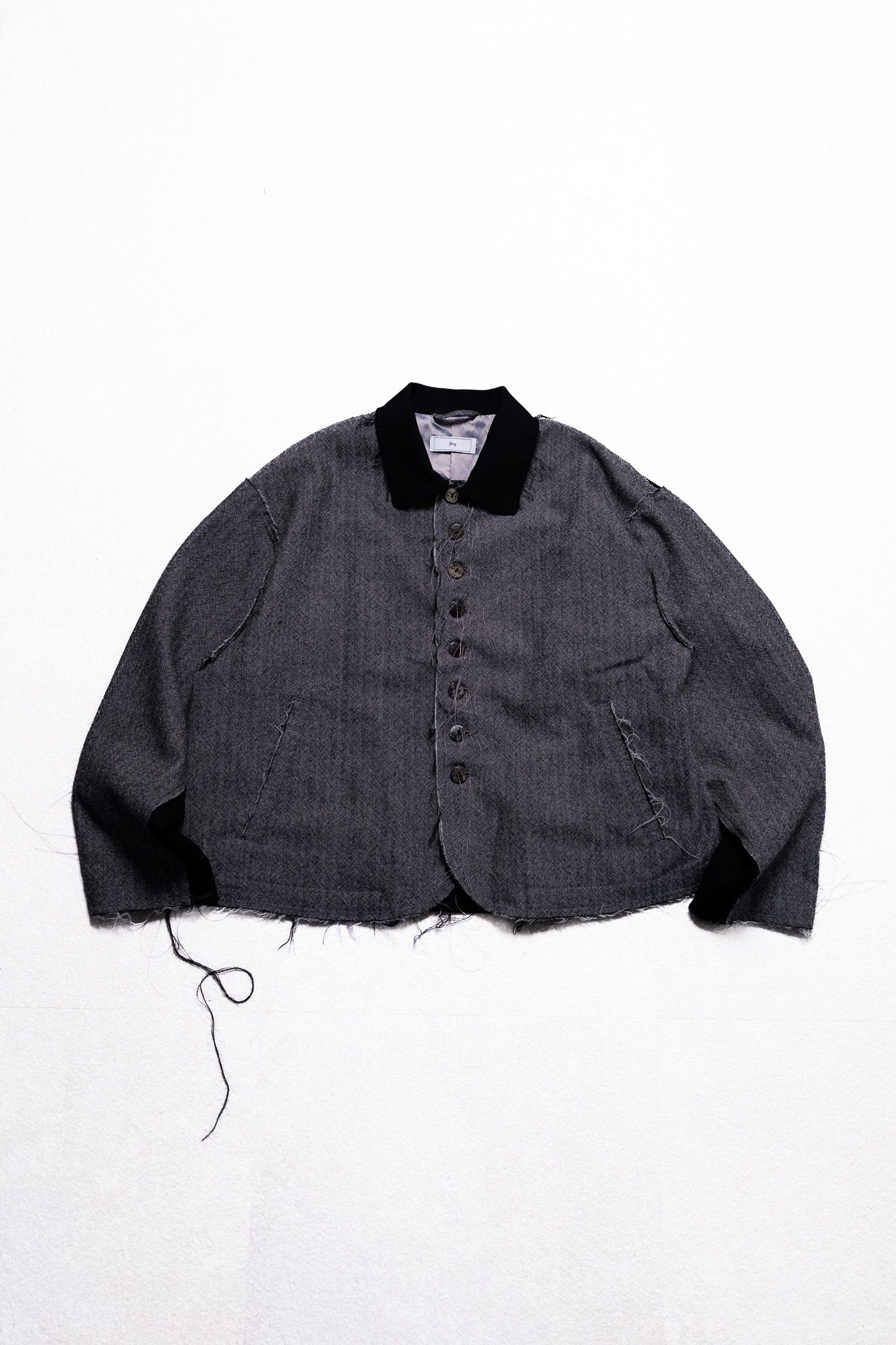 全体に断ち切り加工を施すことで、程よく粗野な雰囲気が加わり、デイリーで着用しやすいアイテムとなっております。短めの着丈に、身幅とアームを広く設定したスタイリングのバランスを取りやすいシルエット。